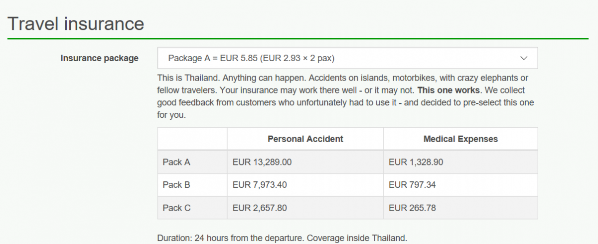 Eine Reiserücktrittsversicherung hätte ich bei der Buchung unseres Zuges von Bangkok nach Kuala Lumpur vielleicht noch erwartet - aber dass ich mich gleich gegen Unfälle versichern soll, stimmt mich doch etwas nachdenklich. Die deutsche Version war dann auch noch viel anschaulicher formuliert: "Entspannen Sie sich, wenn Sie auf Reisen gehen. Eine Unfallversicherung bietet Entschädigung im Falle eines unglücklichen Vorfalls, der den Tod, Verletzungen oder Behinderungen zur Folge haben kann."