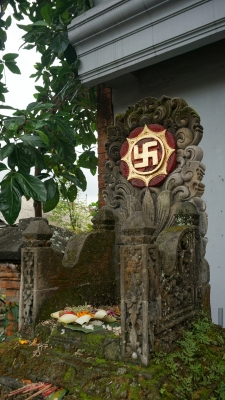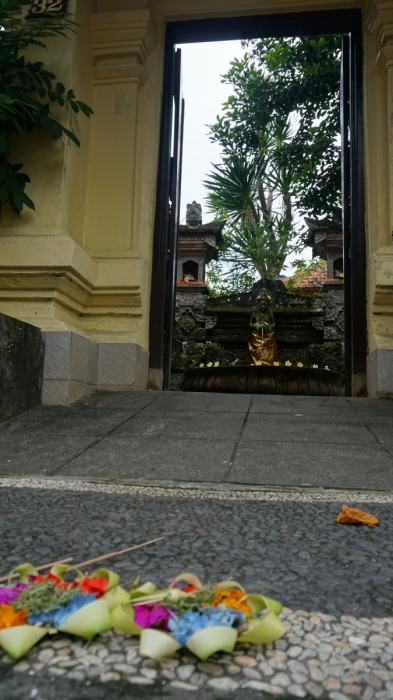 Neunzig Prozent der Balinesen sind Hinduisten und die Insel ist überzogen von Tempelanlagen, groß und klein. Auch viele Privathäuser haben ihren eigenen Tempel oder zumindest einen Schrein, auf dem Opfergaben dargeboten werden. Dies dient dazu, die Götter zu ehren und die Dämonen zu besänftigen. In Ubud findet man praktisch vor so gut wie jedem Wohnhaus und Laden Opfergaben, was ein herrlich buntes Bild abgibt. Meistens handelt es sich um aus Bananenblättern geflochtene Schälchen, in denen Reis, Blumen, Kekse und teilweise auch Räucherstäbchen zu finden sind. Die einfachste Opfergabe ist ein Stück Bananenblatt mit etwas Reis (der vom Frühstück, Mittag- oder Abendessen abgezweigt wird).